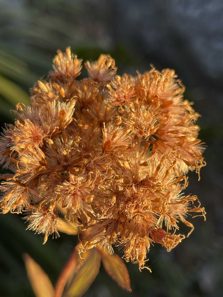 今年の秋にお迎えしたフジバカマの、花後が朝日🌅に照らされて、黄金色になっています。