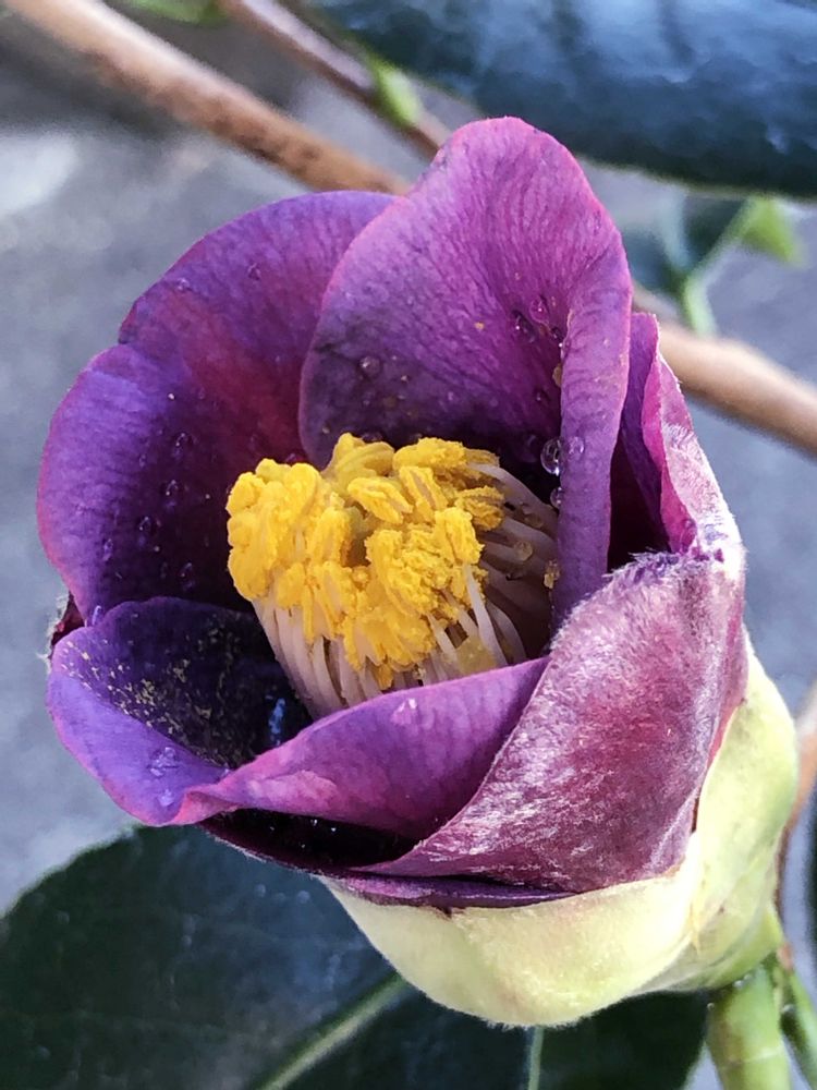 💜椿に刺激を受け🤩、ぐづついた空模様=🏠️引きこもりの間に「廻間紫、はざまむらさき」なる椿を📱で見つけ、1番お安いところでポチッ👆️しました。