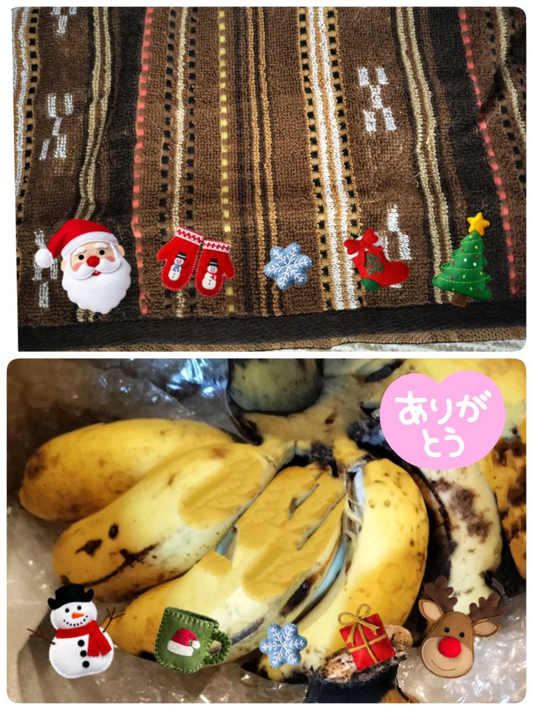 3枚目~はジムから帰宅して夜夕飯の支度してたら又ピンポ~ン〜🎶🎅🎁 珍しい希少な島バナナ🍌を食べさせてあげたいって送ってくれて😆💞 タオルは琉球柄なのかな~😌💖