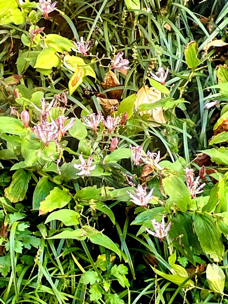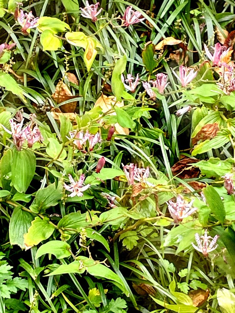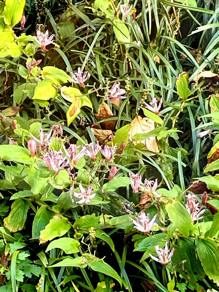 ヤブラン、石蕗、石楠花等色々なお花が時期によって