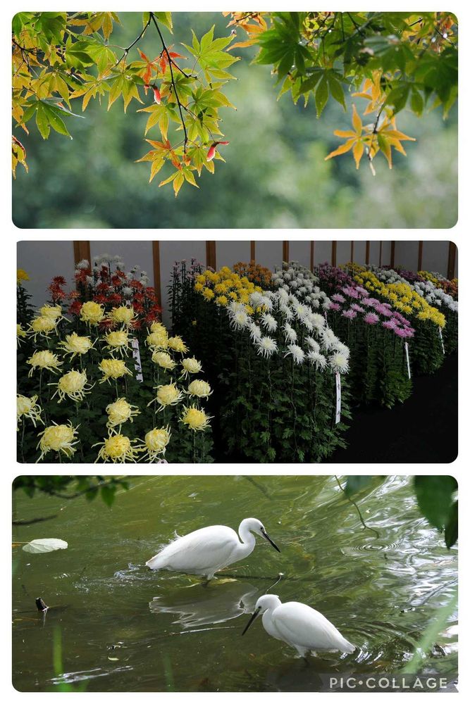 色づき始めたイロハモミジと菊、水辺のコサギさんのコラボが何とも良い色味ですね!