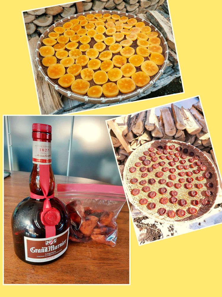 ドライにしてた柿もすっかり飴色になったので、すえすえさんに教えていただいたオレンジ風味のリキュールに漬けてみました🥃🧡