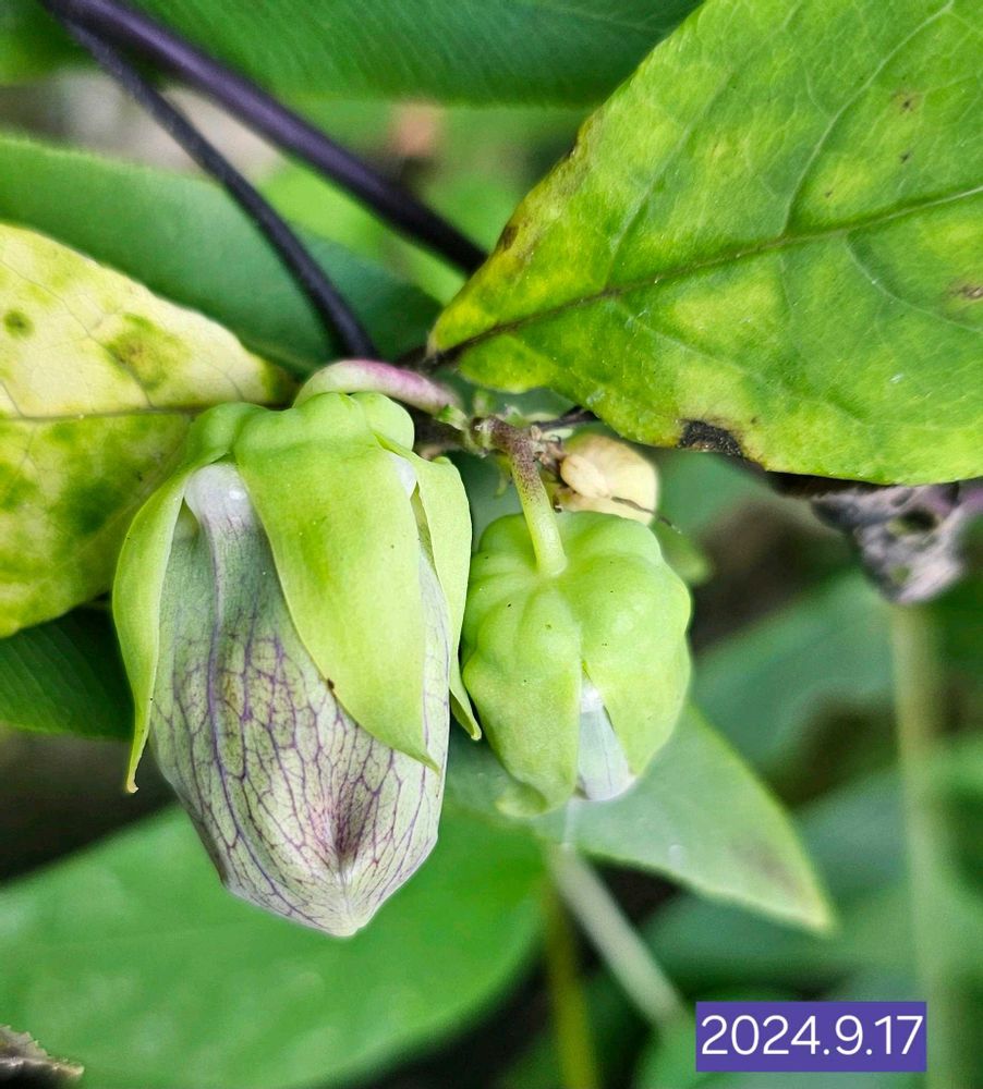 春に芽を出し蔓を伸ばし 9月17日側枝の先に釣り鐘状の形をした淡緑色の蕾を2個つけたツルニンジンをみつけました