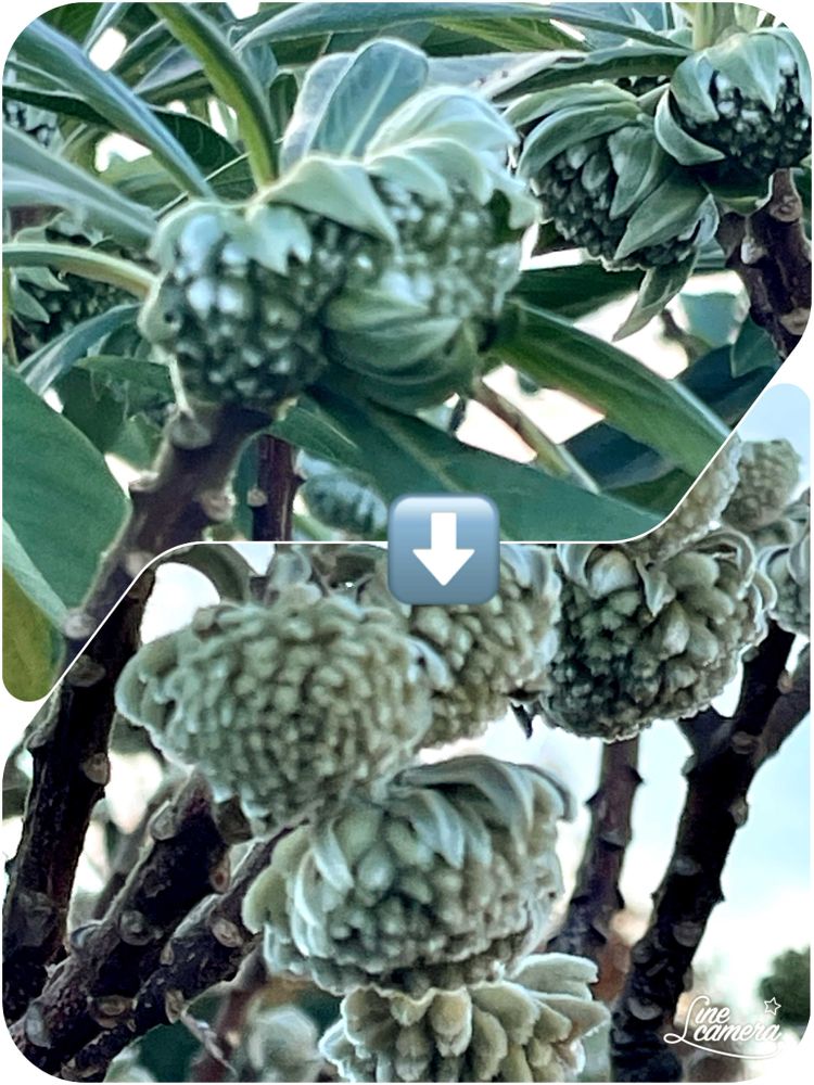 1ヶ月前(上)はモスグリーンの蕾を付けていました