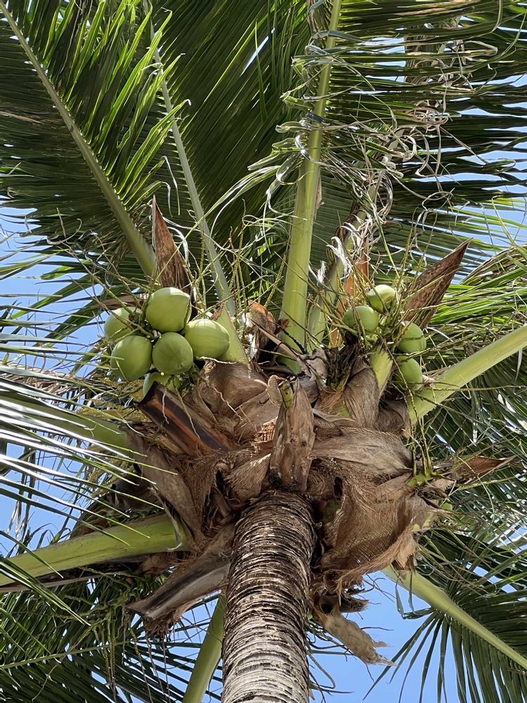 街中に植えられたココヤシ、何気なく見上げたら実がなっていました。