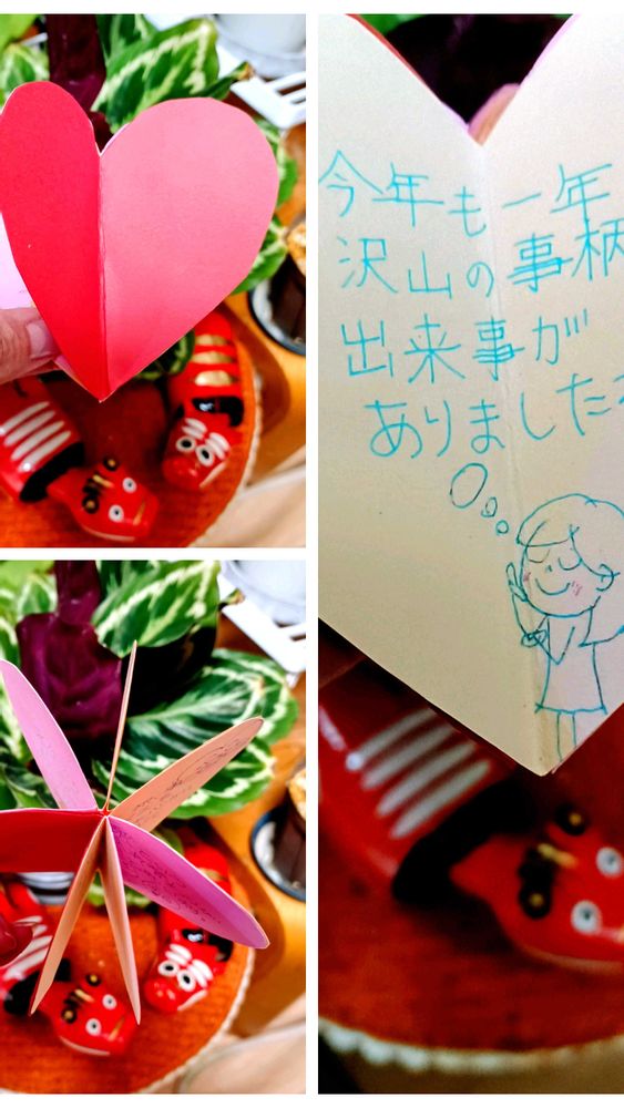 ハートの紙をつくって、1枚1枚に文章とちょっとした絵を描いてみた_φ(°-°=)