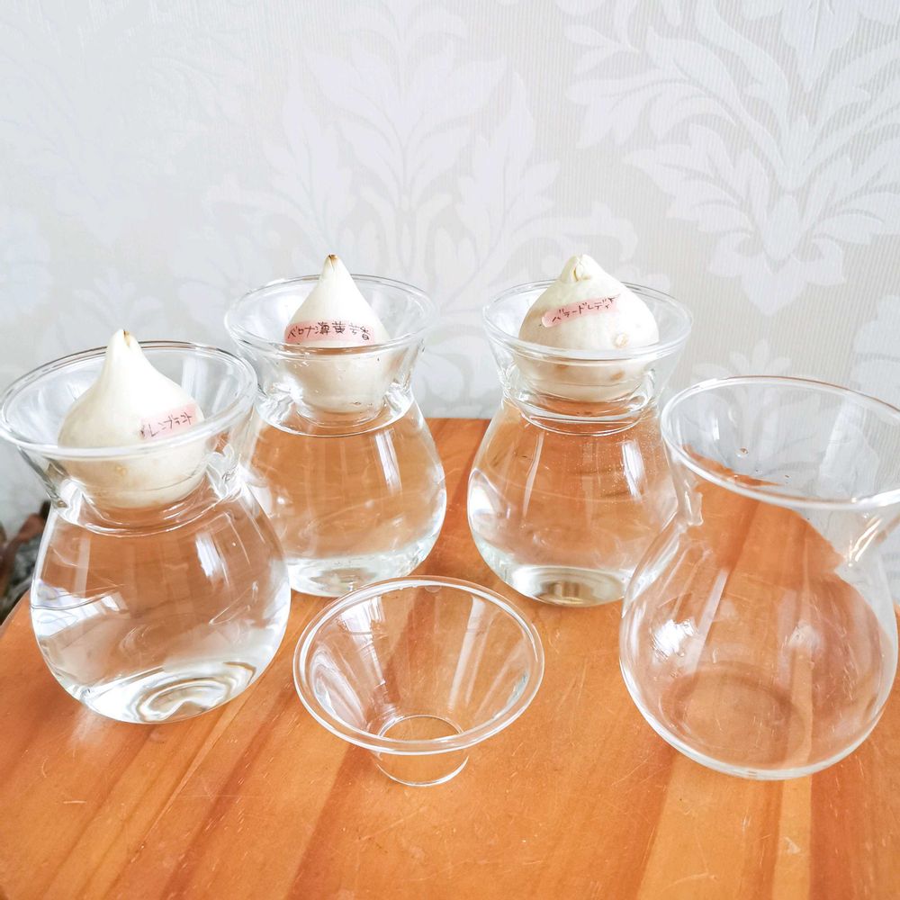 2ヶ月程冷蔵庫で冷やした球根のおしり?を水に着けて、発根させます
