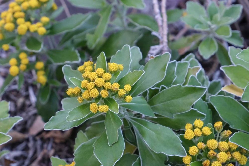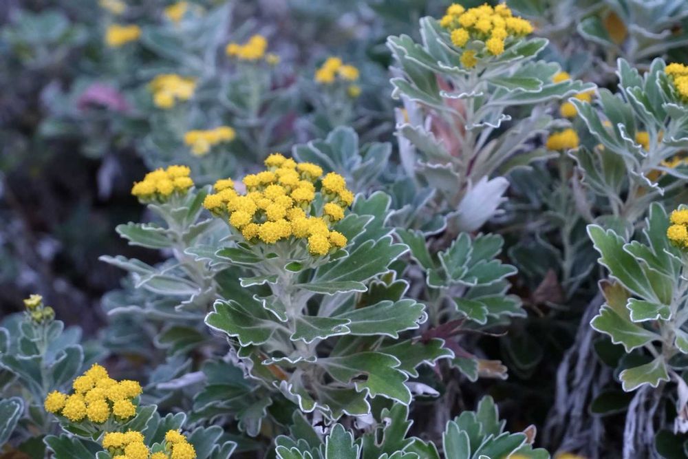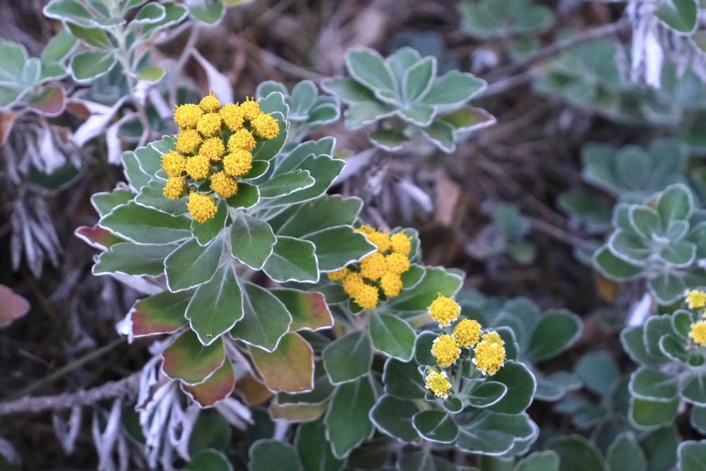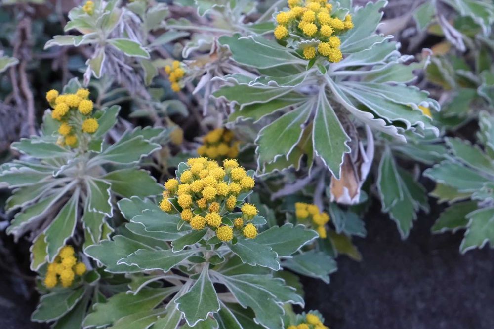 葉の縁取りと ところどころの紅葉も可愛いイソギクですが、コロニーによって葉の色形が違う種類のように異なっていて不思議でした。交雑の妙なのでしょうか。
