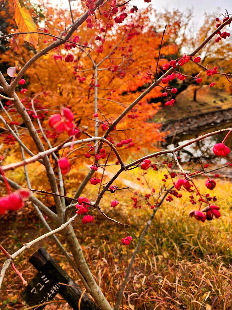 紅葉をバックにマユミの実が可愛い