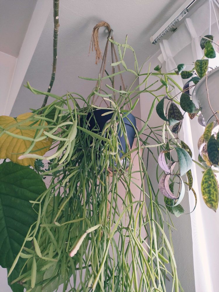 春に小虫が出たためベランダで管理していたピンクサリー。だいぶ伸びたので麻紐の長さ調整をしました。それでもまだ下についちゃってるけれど💦