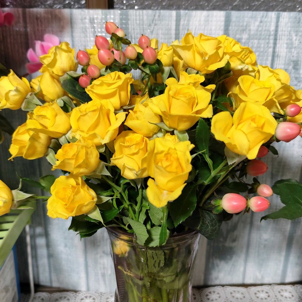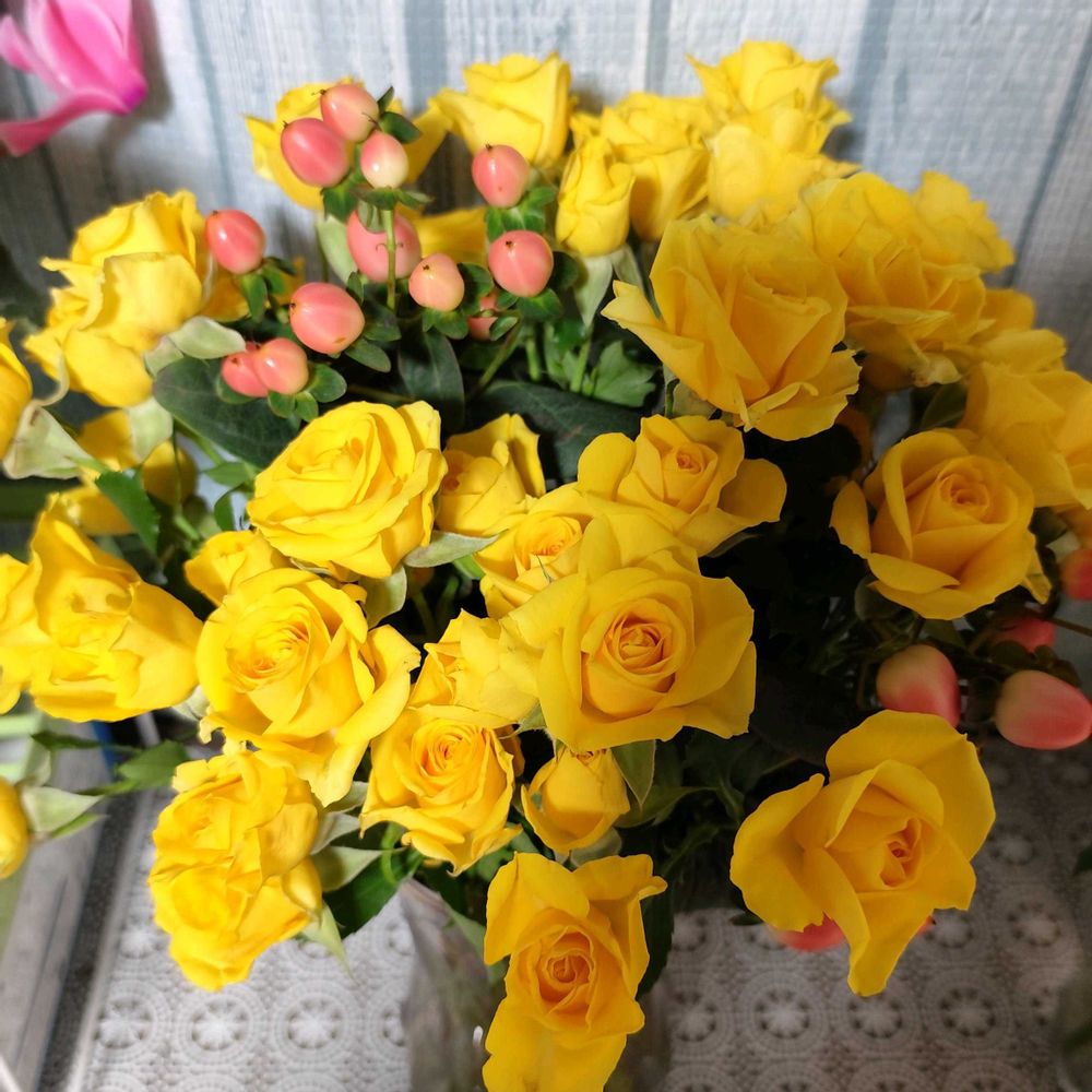 こちらは黄色のスプレーバラちゃん&ヒペリカム🫒今が満開かな?🥹フレアをパアッと開いて元気いっぱいにお部屋を華やかにしてくれてます💐