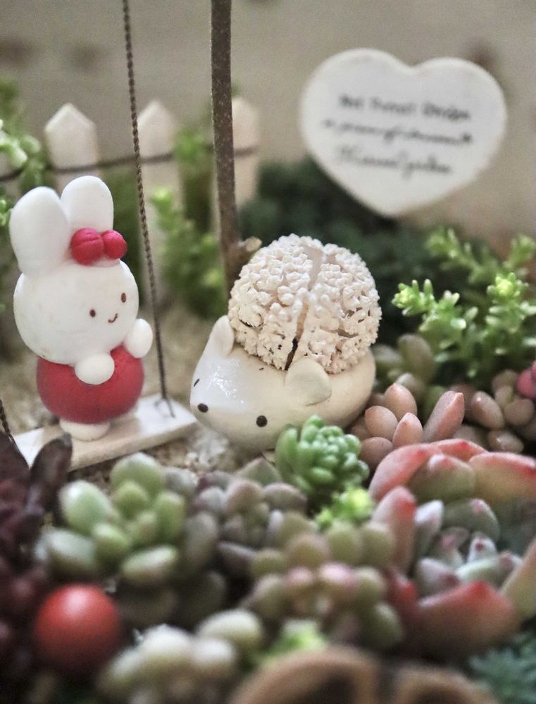 ウサギさん達のキャラクターも、多肉の寄せ植えの持つ雰囲気も、ほんわか気分にさせてくれます。
