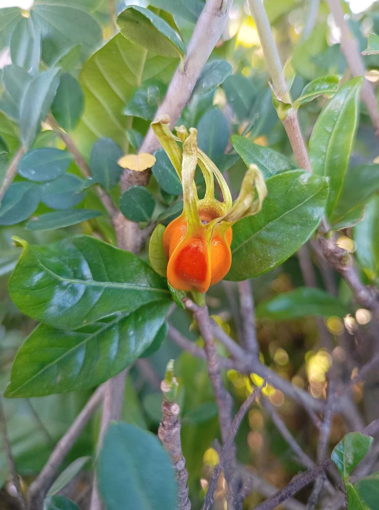 ショッピングモールの植え込みに綺麗な色のクチナシの実がなってました。