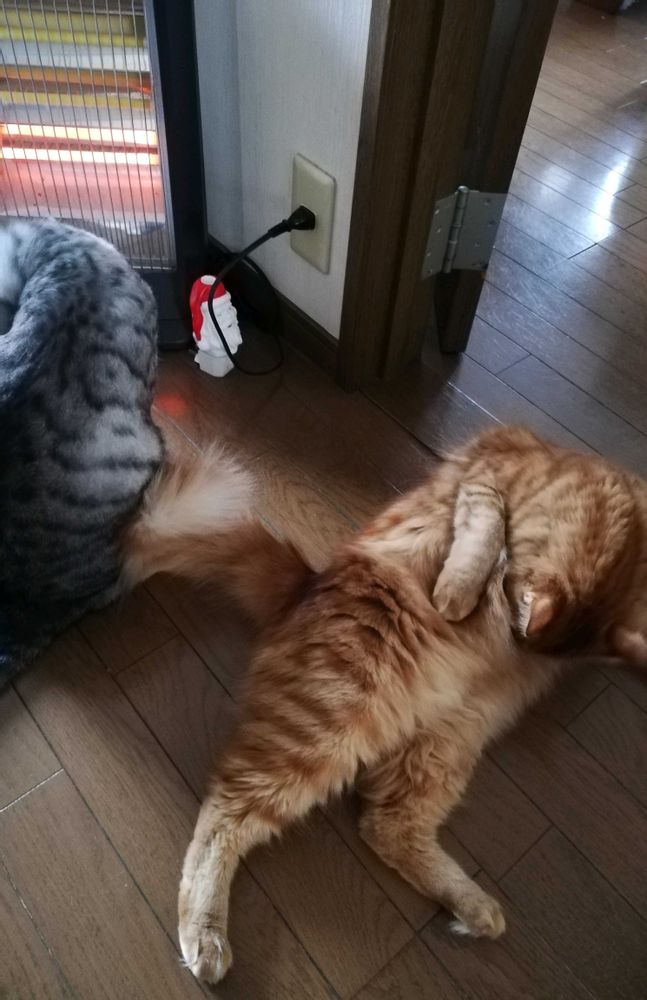 寒くなって 廊下が寒いから 古い電気暖房器具をつけると 毎日 にゃんこ🐱たち そこで まったりしてます🎵