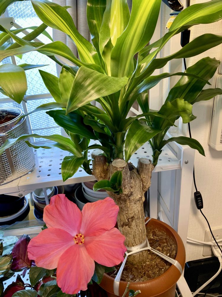 ドラセナマッサンゲアナ😊とハイビスカス🌺インドアハイビスカスサニーシティ初号機😊南国LOVE❤️🏝️アロハ🤙🤙🤙