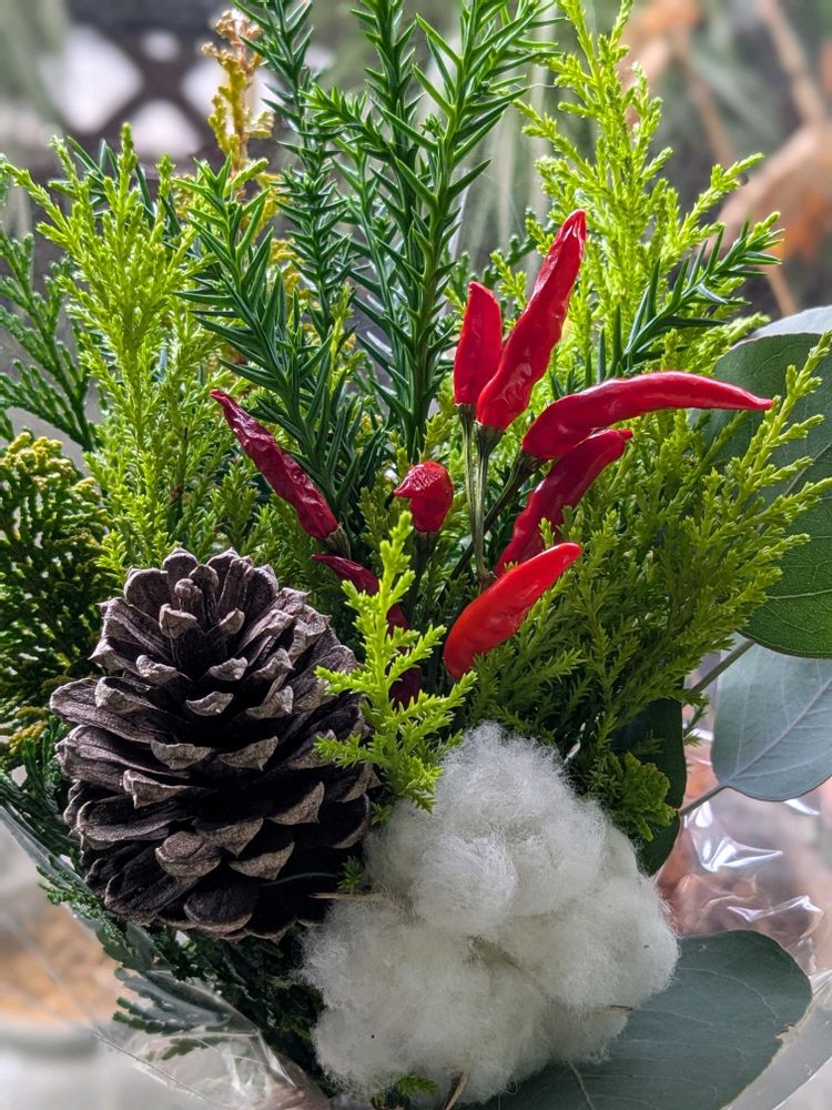 いつもの産直のクリスマスアレンジです。レジに並んでると後ろの人から「いいね👍️」って声をかけられましたよ。