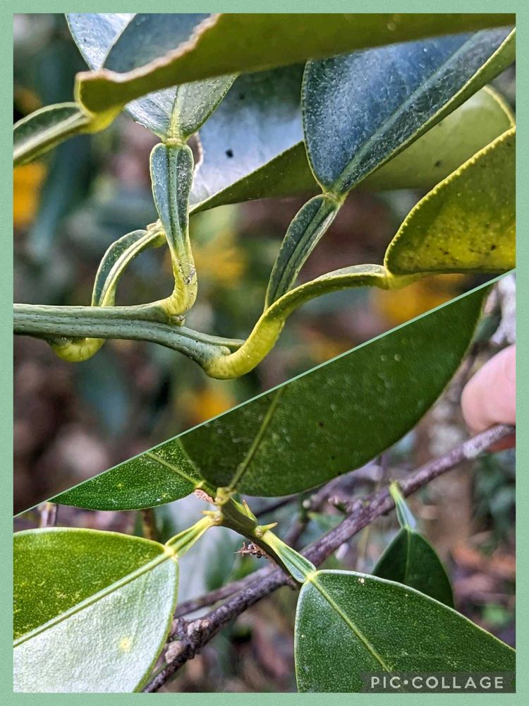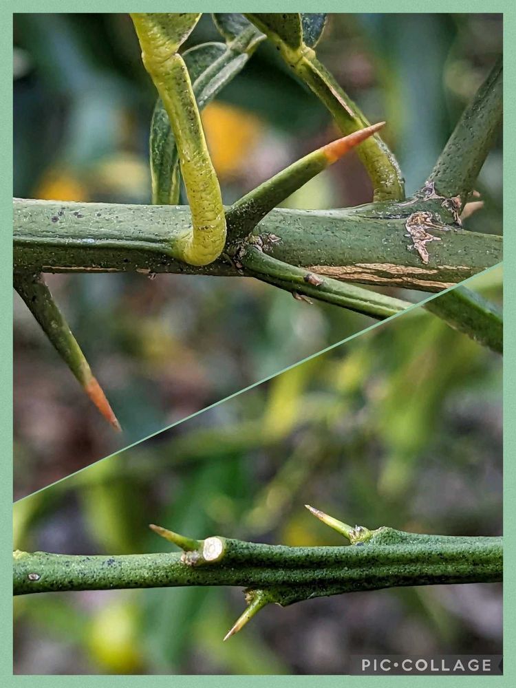 ④⑤上 ユズ、下 似ているキンカン どちらも葉の根元に翼、枝にトゲがあります