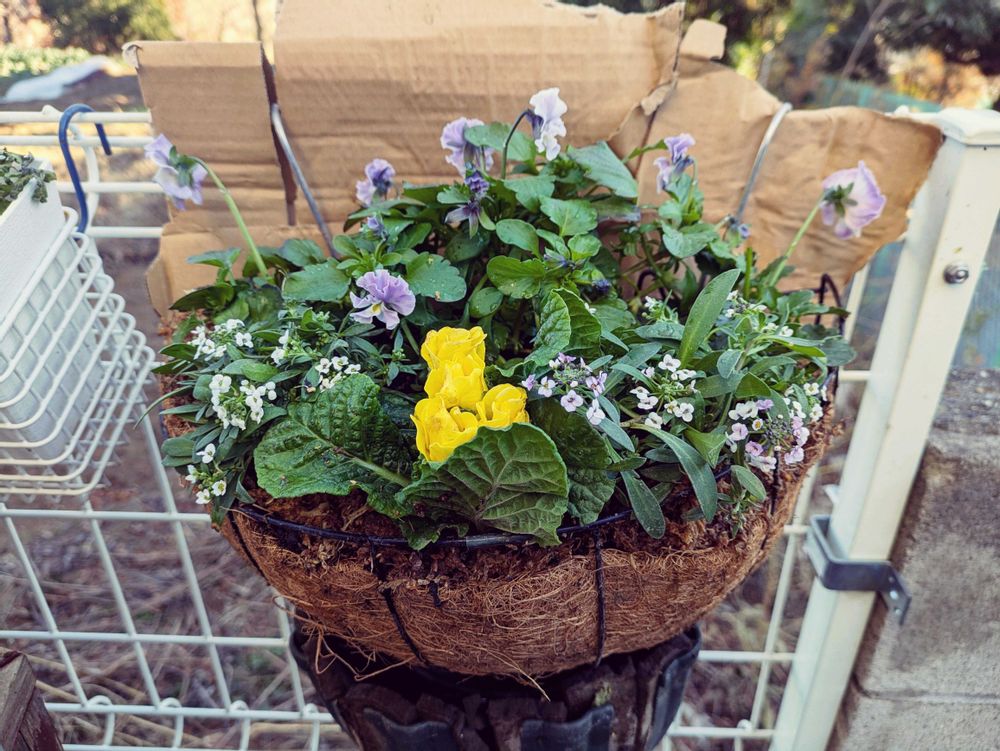 久しぶりに寄せ植え作りました。段ボールがちょっとだけど風避けの為。