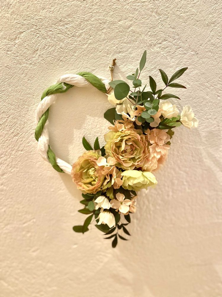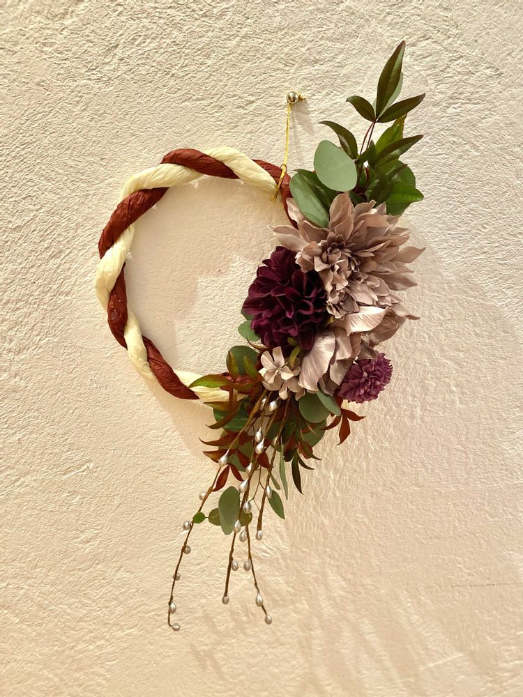 100円ショップに飾りのないしめ縄だけ売ってるので好みの造花をグルーガンでペタペタ貼り付けるだけなので簡単ですよ♪