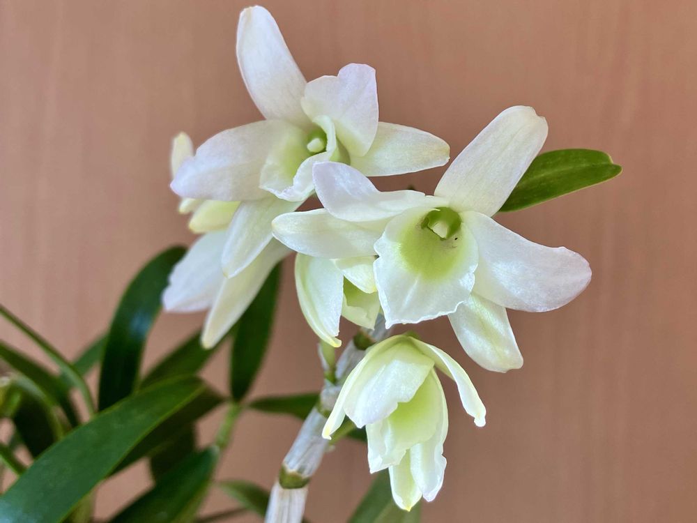 デンドロビウム❀グリーン愛さんは少し小さくて楚々としています。他の花芽はまだ硬いので、お部屋に入れた第1陣が咲いたようです。寒い時期は嬉しいです♡