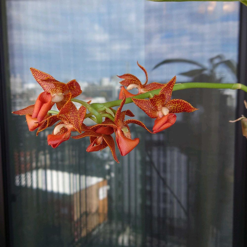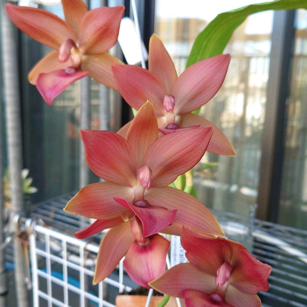 3枚目は去年花茎2本5輪の花を咲かせたシクノデス交配種。今年は花茎一つですが6輪咲いてます。思っていた以上に花が重くて、花茎が折れかけてしまい慌て後から支柱を立てました。考え無しで駄目ですね。