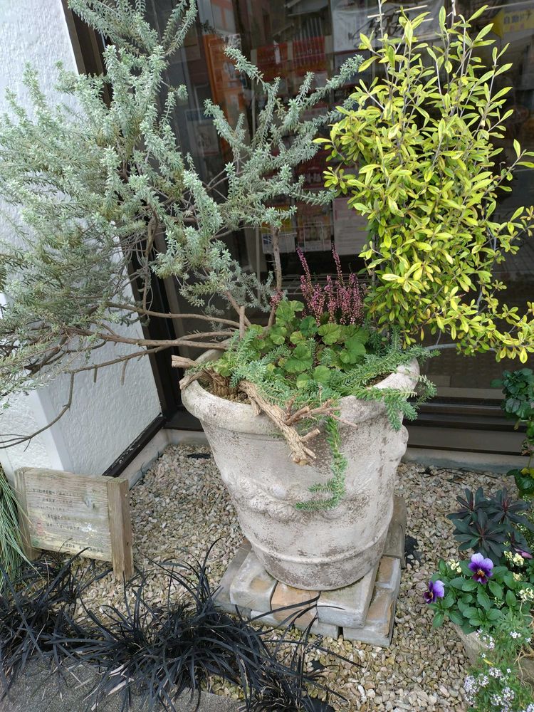 入口横の花壇にはどっしりとしたテラコッタが数鉢置かれています。
