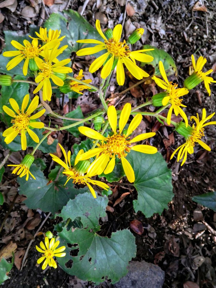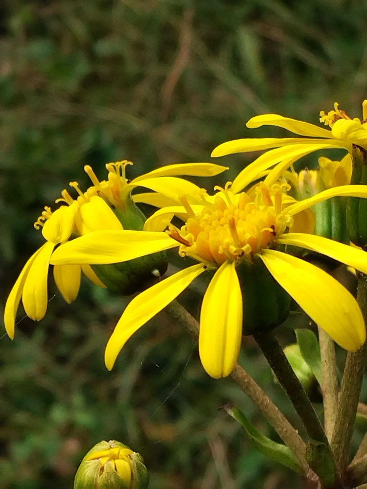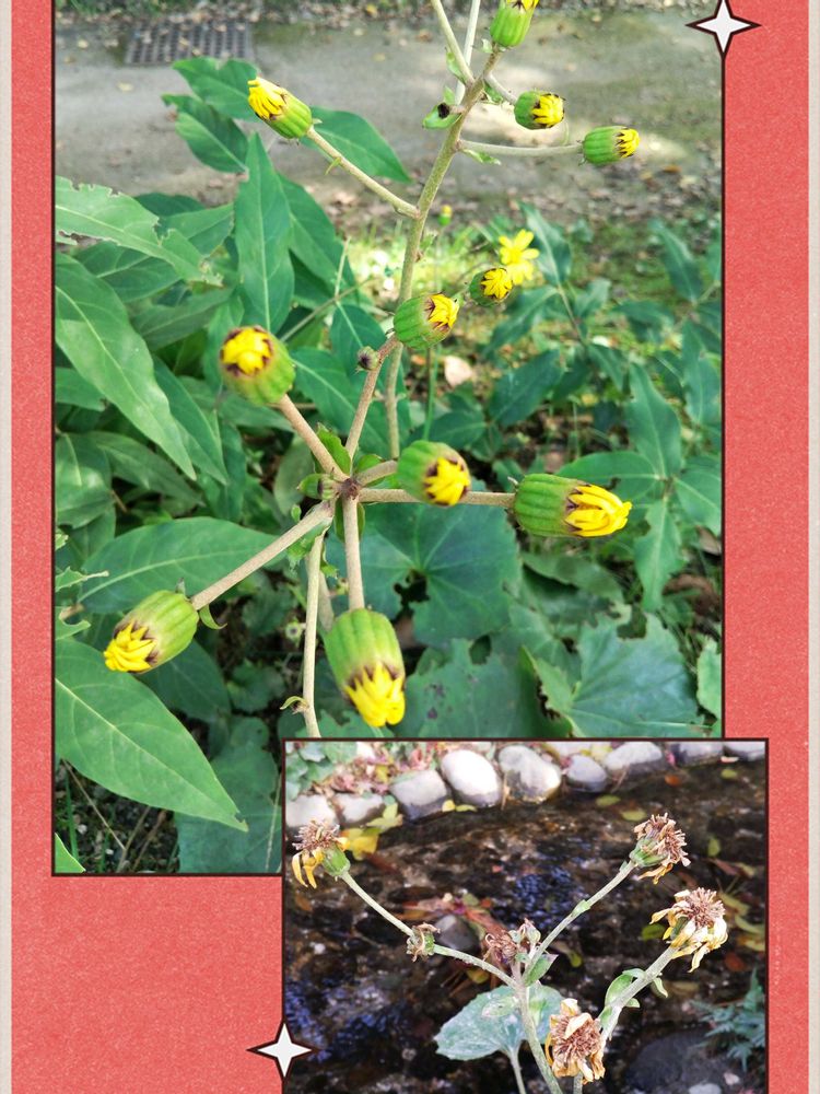 ⑤はツワブキの蕾と昨日栗林公園で出会った花が終わったツワブキです