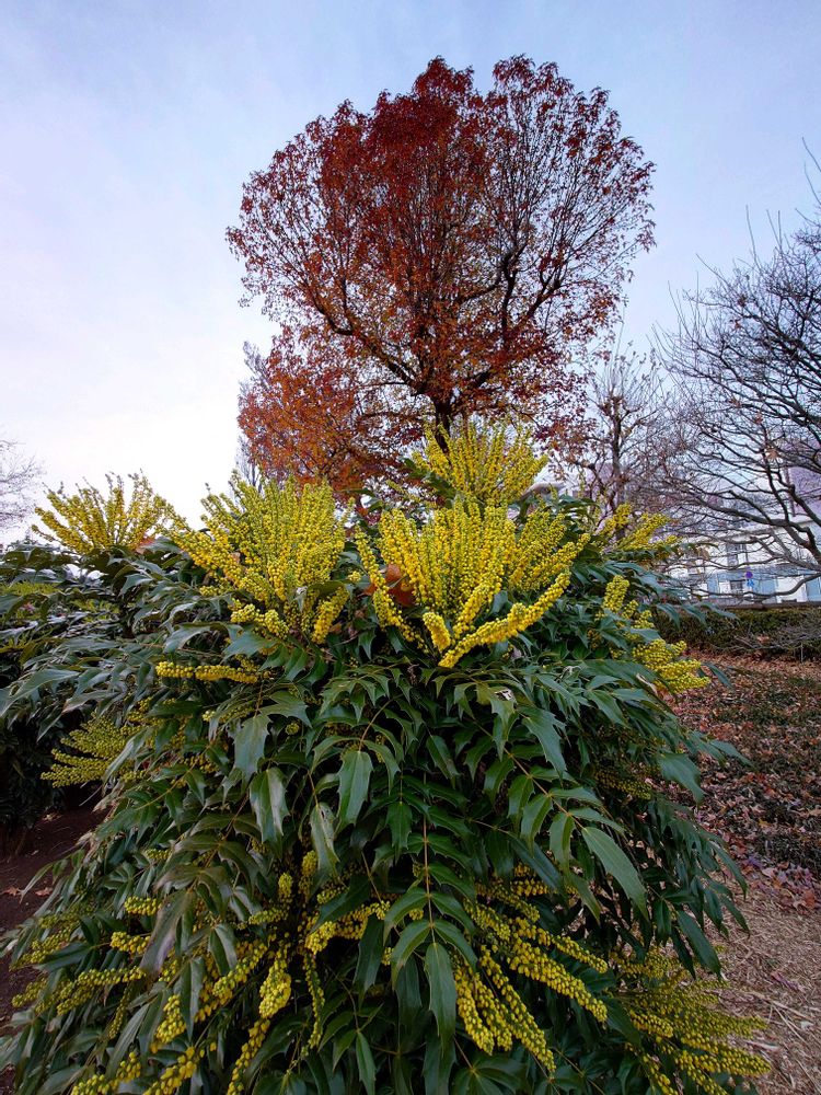 モミジバフウを背景に、ヒイラギナンテンの花がたくさん咲いています😮 この時期に咲くんですね😀