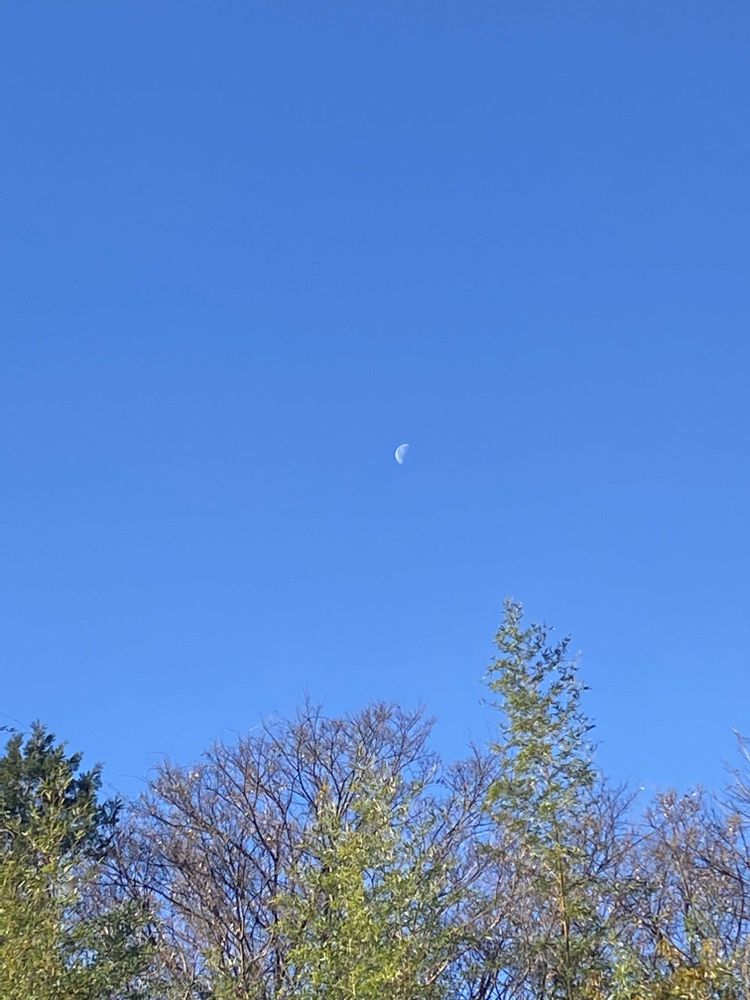 朝の散歩で見た青空に三日月🌙がまだうっすらと。