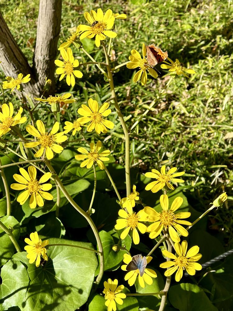 勤め先の敷地内の植え込みで咲き始めたツワブキ。昼過ぎの陽だまりに蝶や🦋蜂🐝が集まっています。隣には真っ赤に色づいたニシキギ。