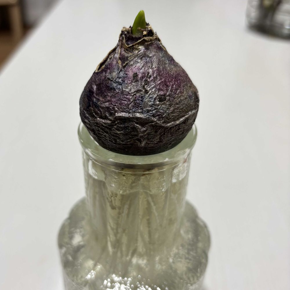 水耕栽培のヒヤシンス今年は遅かった為2つしか😓娘と1つづつ育てています やっと芽が出てきました根はいっぱいです💕