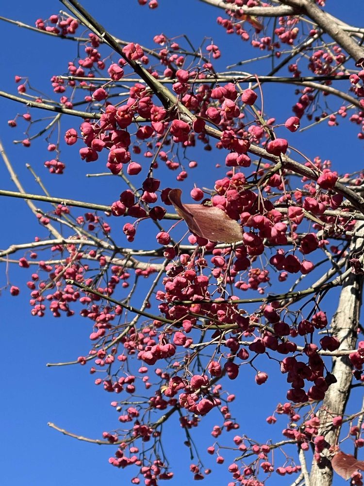 青空にマユミに似た赤い実が綺麗です。散歩中に、出会いました。