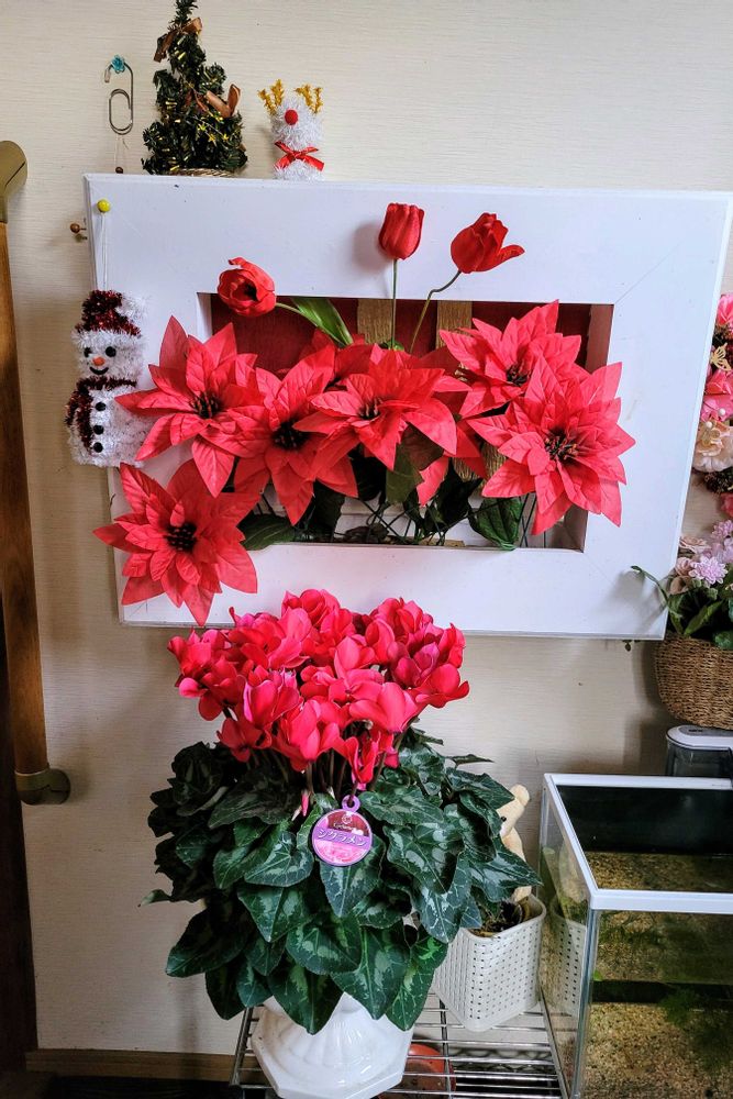 ③我が家の玄関真っ赤なシクラメン🪴❤️と造花ですが白い壁掛けプランターにポインセチア