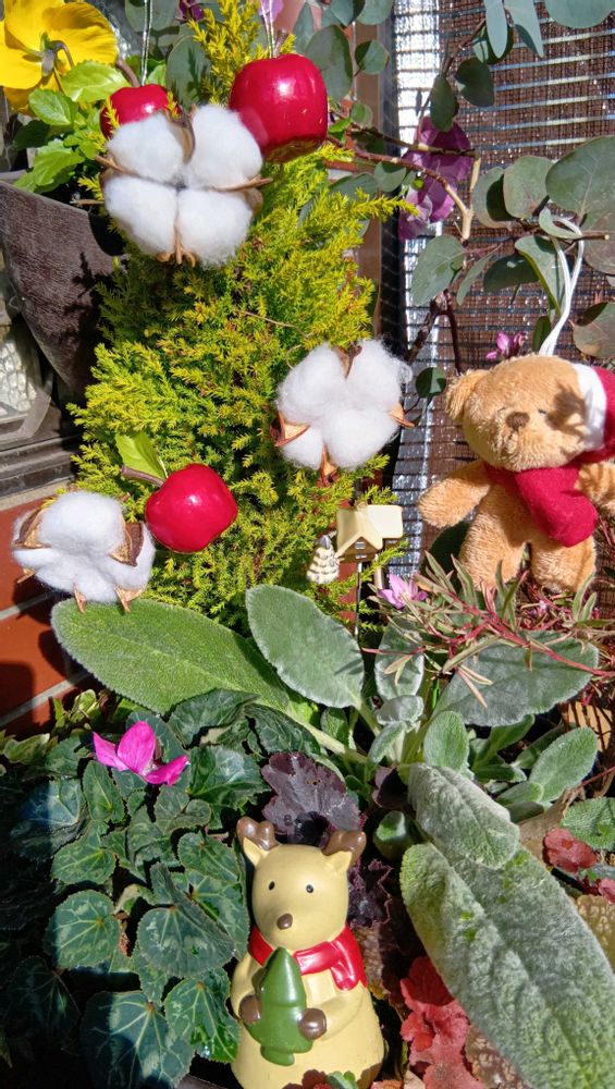 コニファーに、飾り付けしました。毎年、同じ🍎と、🐻の飾り物ですが、、、、