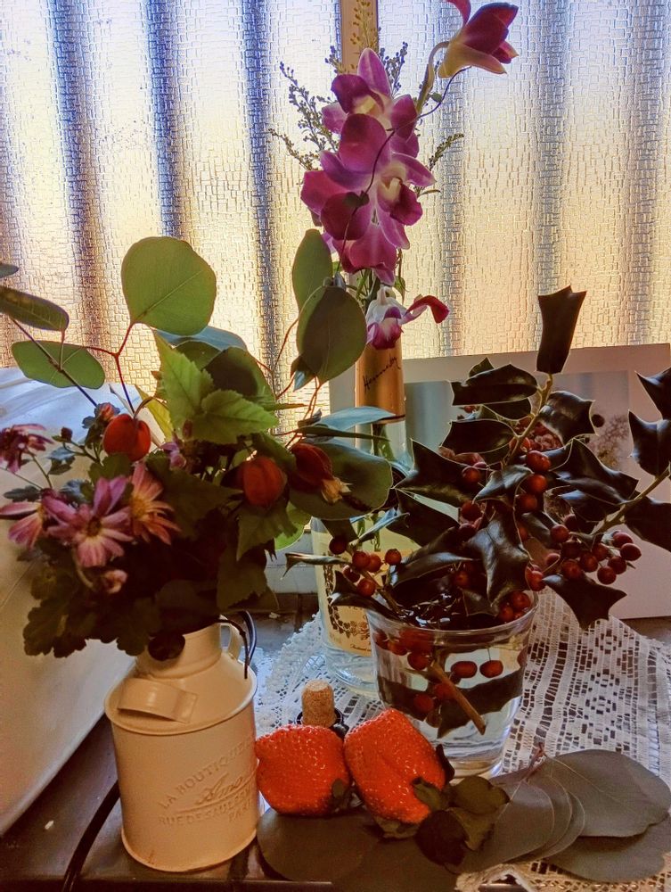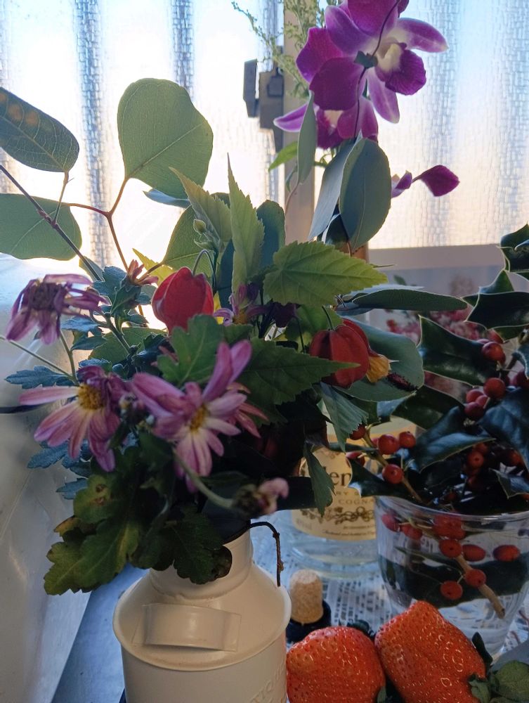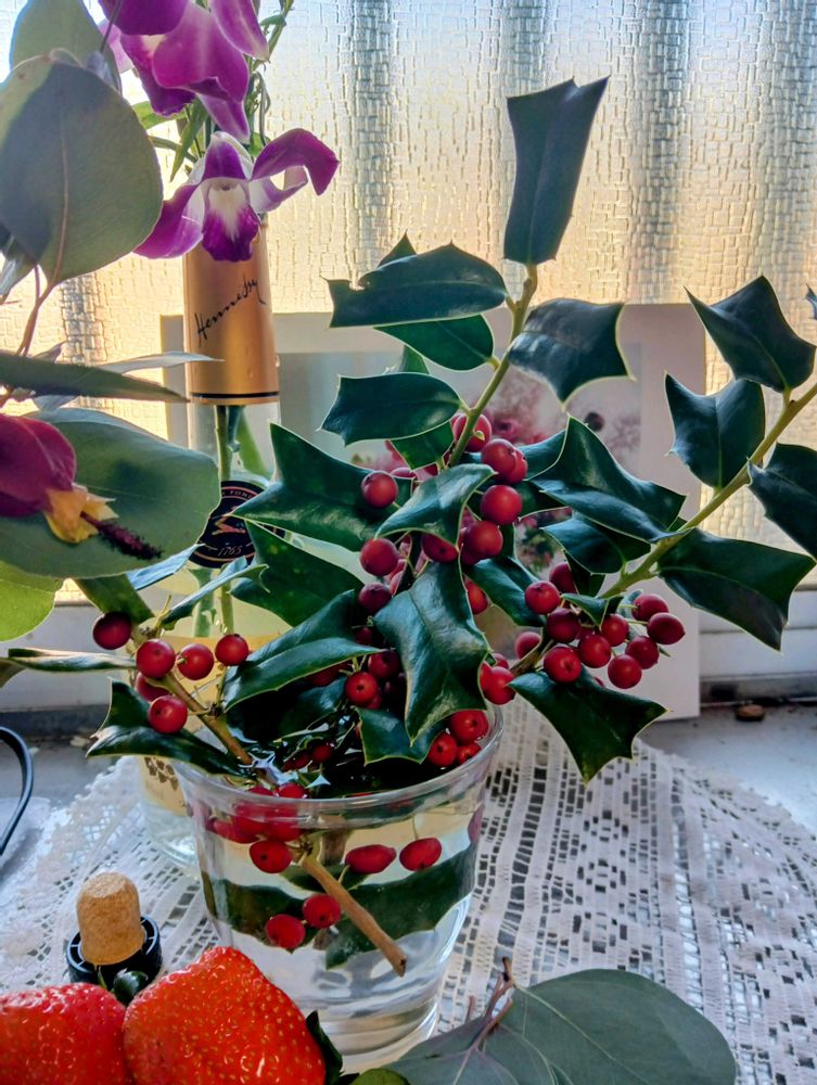 暖かい日、songん家のキッチンフラワー、クリスマスホーリーの赤い実が可愛い🔴♥️