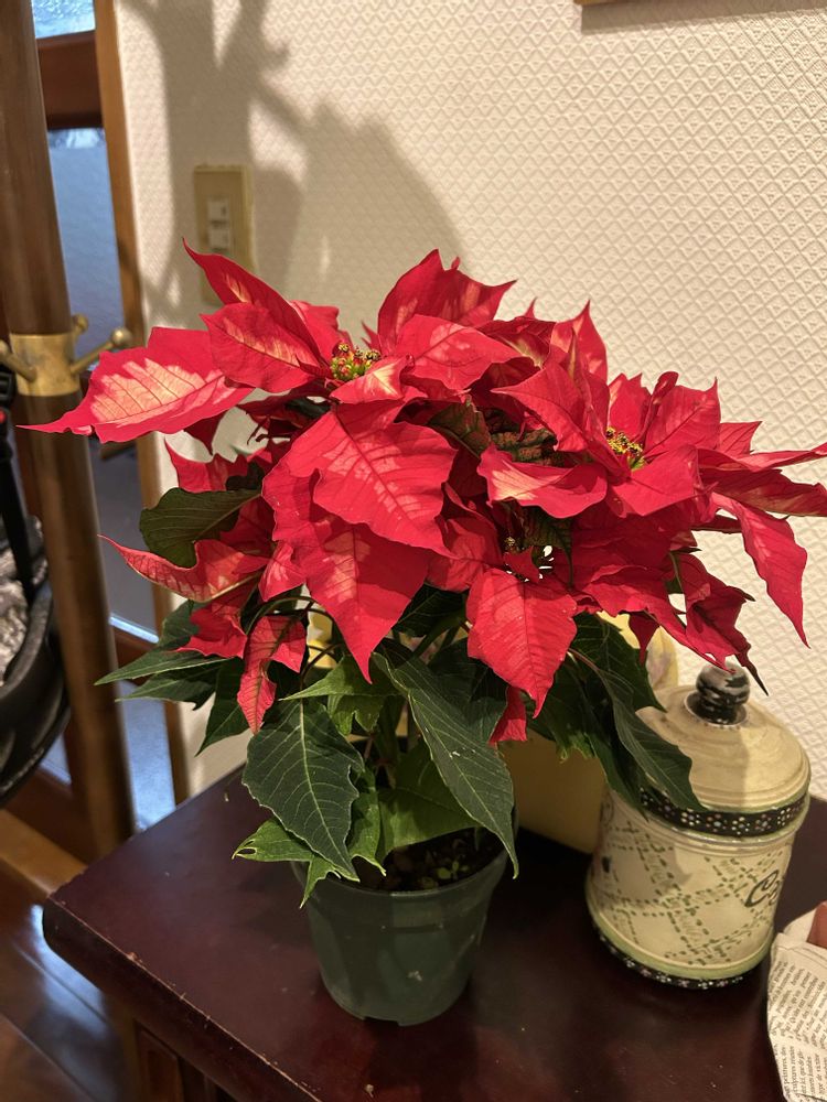 3年目のポインセチアなかなか綺麗に赤くならないし、樹形みだれてるから、2年が限界かも