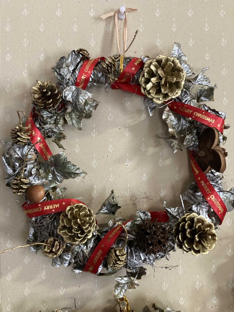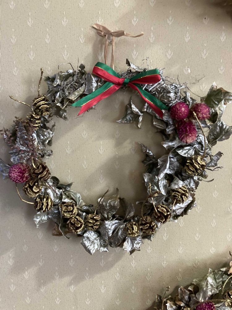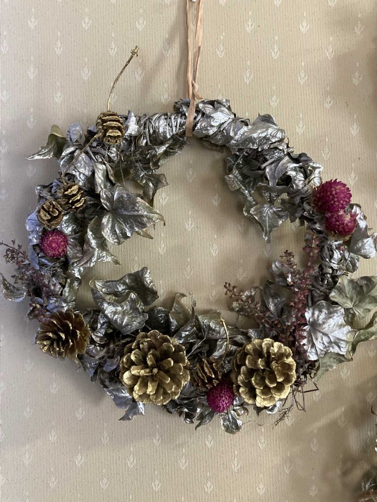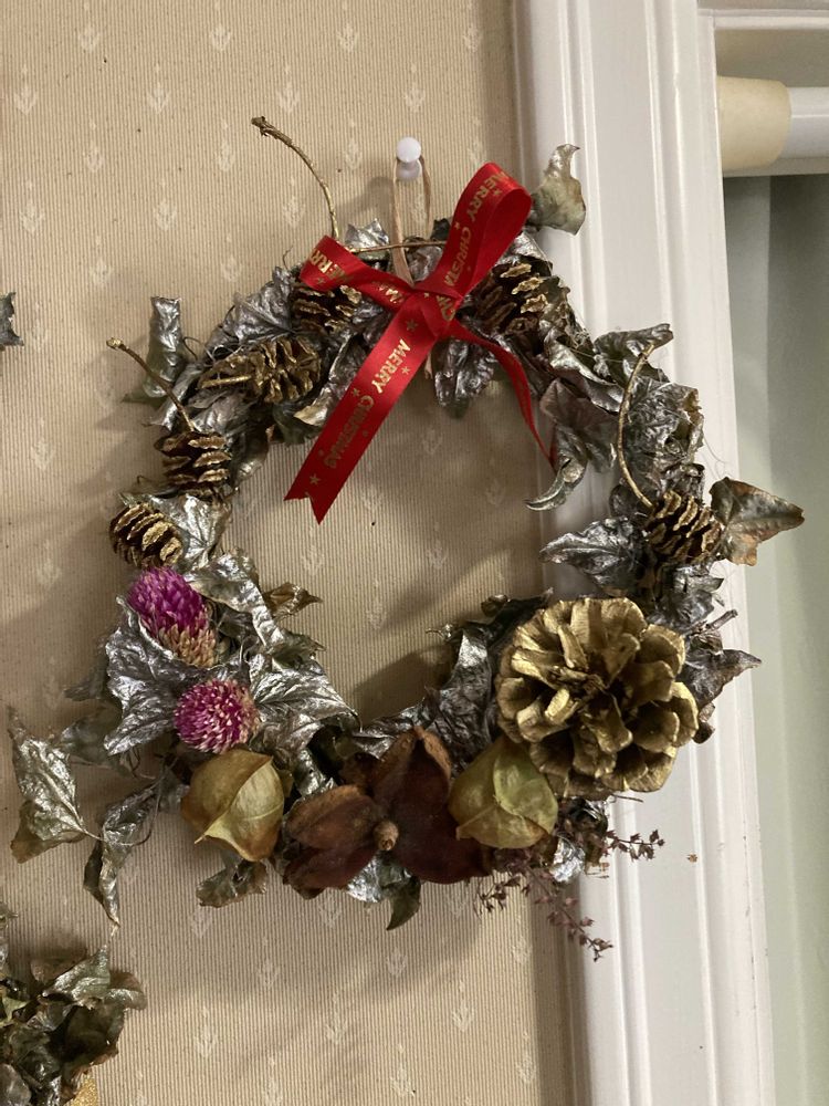 庭のへデラを使って、クリスマスリースを作りました。銀色のスプレーをかけ、マツカサなど木の実をゴールドのスプレーで、千日紅をあしらいました。地味かなとも思って、リボンをつけたリースもありますが、つけない方が好みです♪