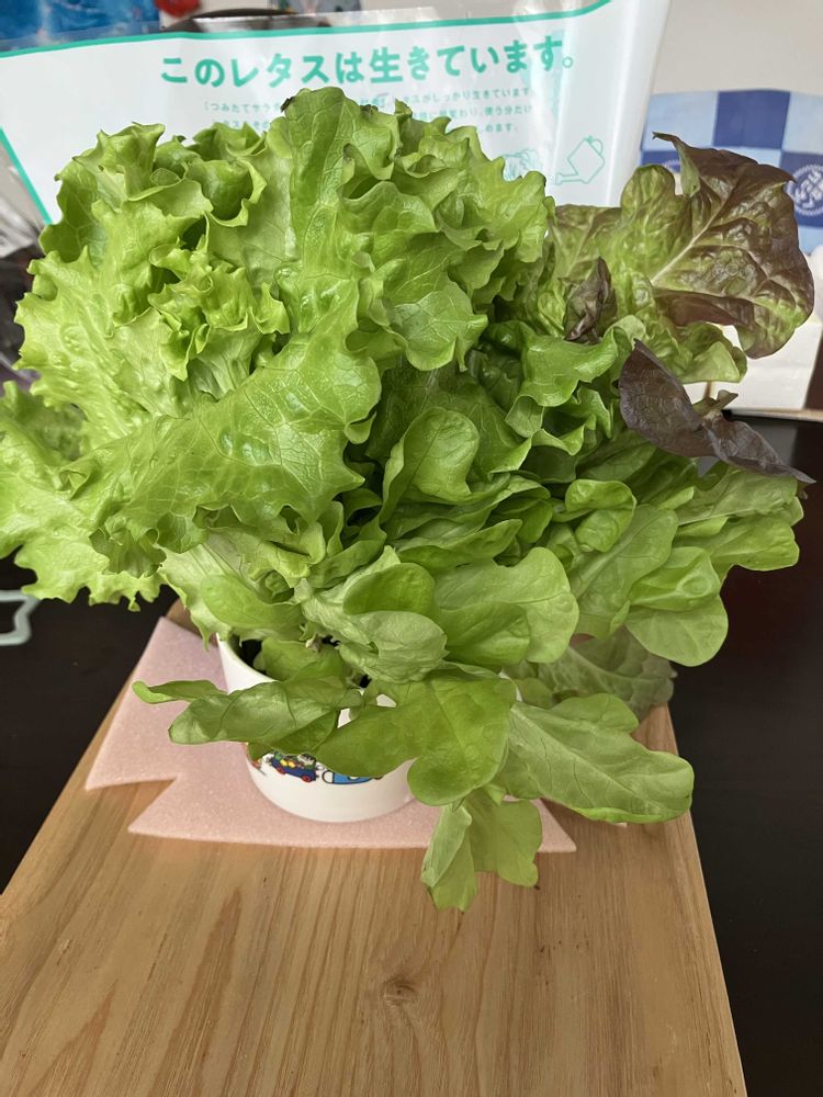 部屋の中にはフレッシュグリーンのレタス3種が、根っこ付きなので摘み取りながらいただきます😋
