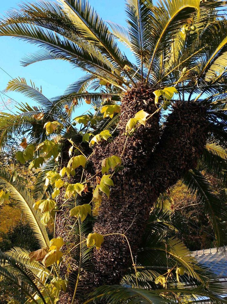 大きな蘇鉄の木に何かツルが這い良く見たら可愛い縞模様のスズメウリが生っています