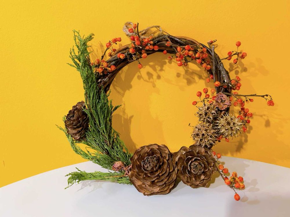 5枚目)ツルウメモドキを渡されて、材料費ゼロで作ってみた自作のリース