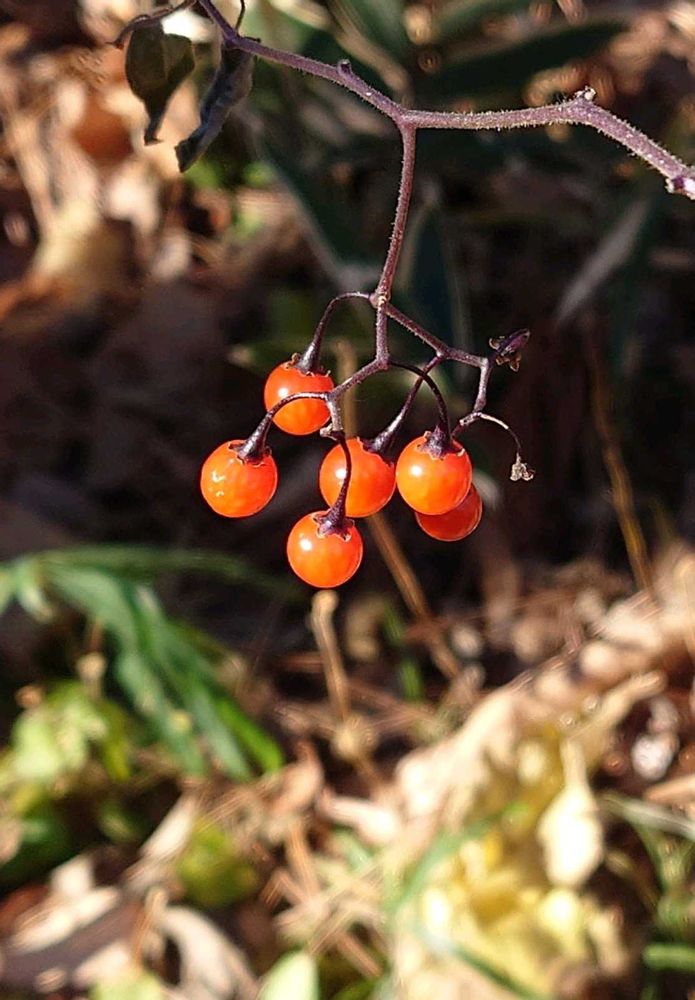 陽だまりの中、オレンジ色のヒヨドリジョウゴの実、葉はもうありません🟠🌿