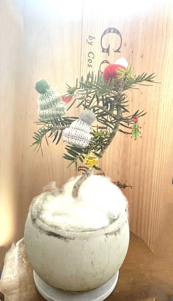 クリスマスの飾りの木はもみの木だよね🌲小さくてかわいい😍帽子は作ったの?