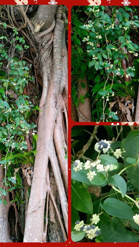 ガジュマルの幹&気根に垂れ下がって鈴なりに白い花。よ〜く見る🕵️と所々に黒い実をつけています