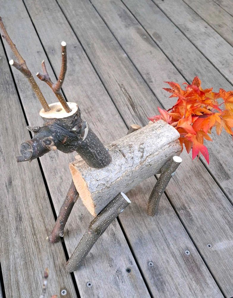 栗の木、ジューンベリー、モミジなど、剪定枝を寄せ集めて、旦那さんが、鹿?を作ってくれました。紅葉は散ってはいましたが、まだ切らないでって言ったんですが…。