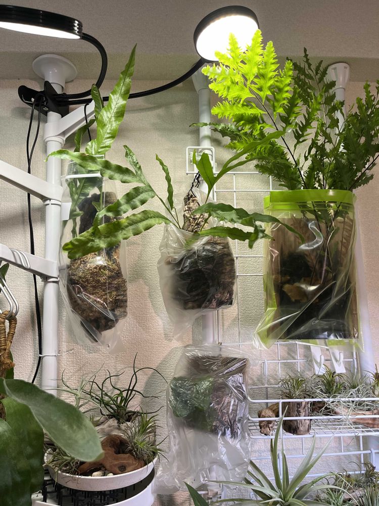 壁のビカクやドリナリアのコーナーはエアコンの風が直撃するので、ビニール被せてみました🙌🏼