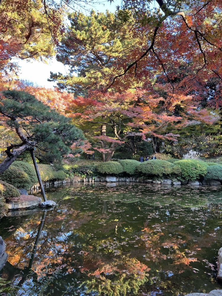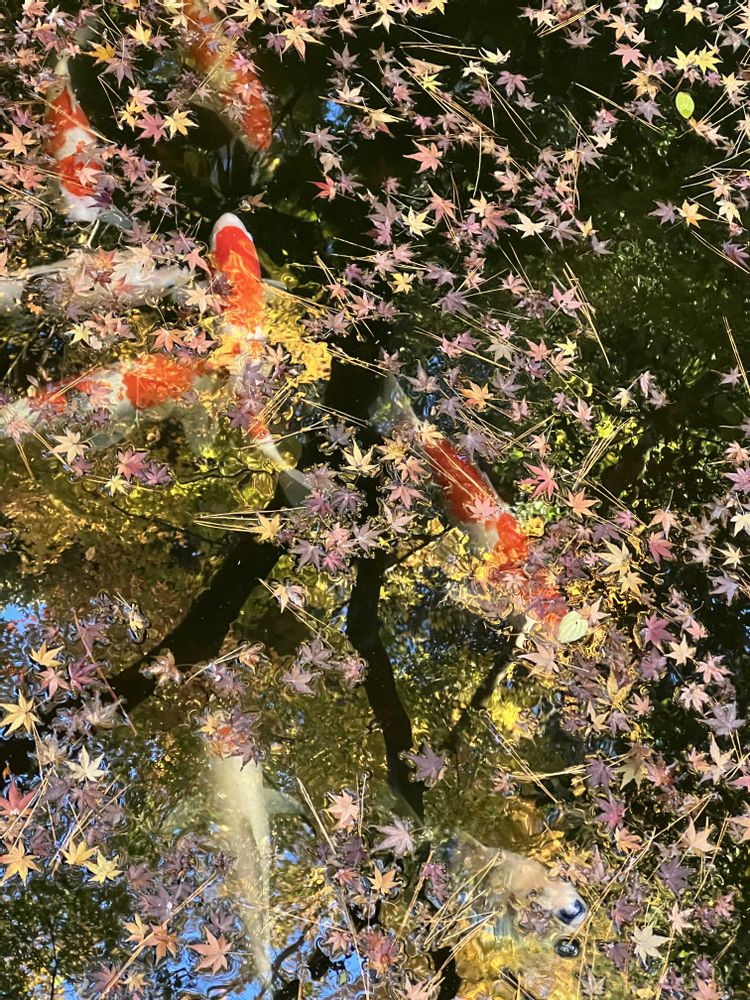 水面のモミジの下に、鯉が次々と来てくれました😄