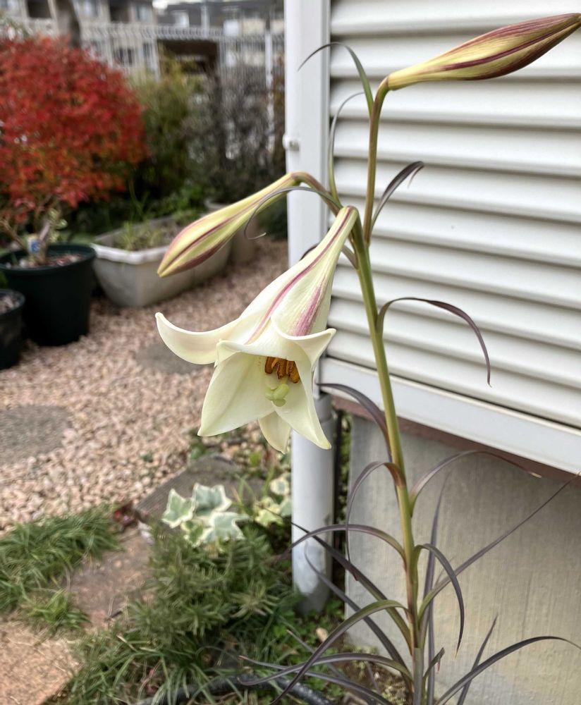 お久しぶりの投稿です〜😊零れ種で咲いてるタカサゴユリ。一番冷え込んでる今、咲いてるし〜😳今年は何だかんだ暖かかったからかな??葉っぱ紅葉してる。ユリの紅葉なんて、見たことないな😆
