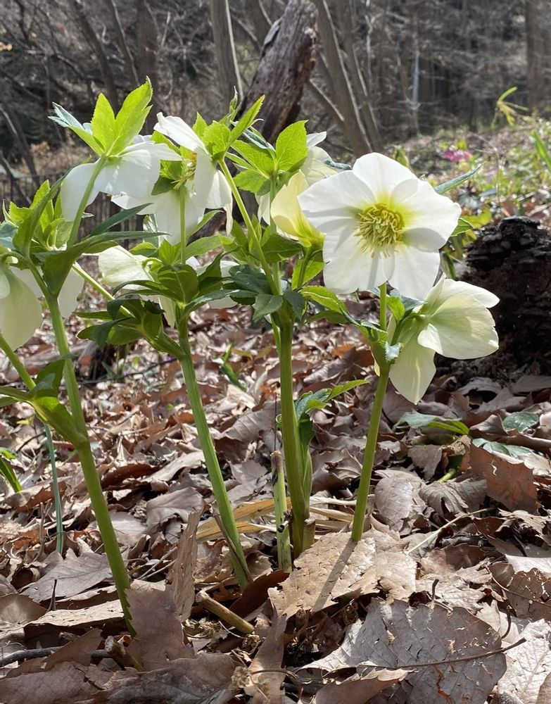 3月の林の中にニコニコ楽しそうに咲いてるはクリスマスローズです。