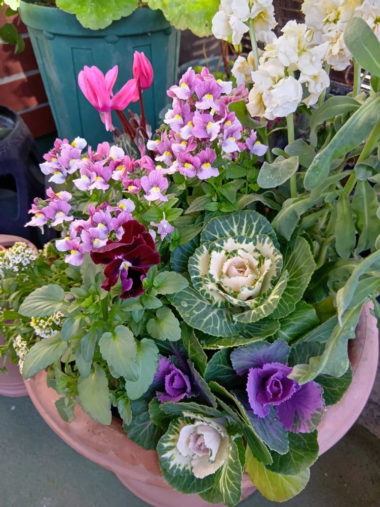 今年は、おまかせの苗で、葉牡丹の寄せ植え作りました。🥰
