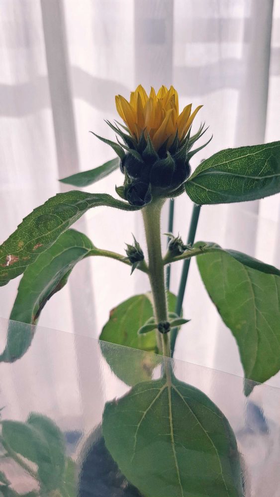 11月に畑の隅っこで伸びてきてたひまわりが可愛くて、鉢に植え替えて出窓に移しました。